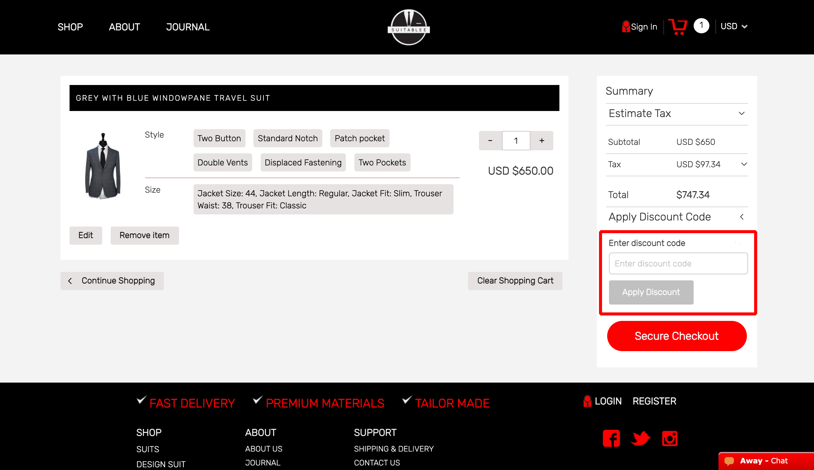 Talk to us on our Live Chat or call us at 1-855-979-SUIT(7848)