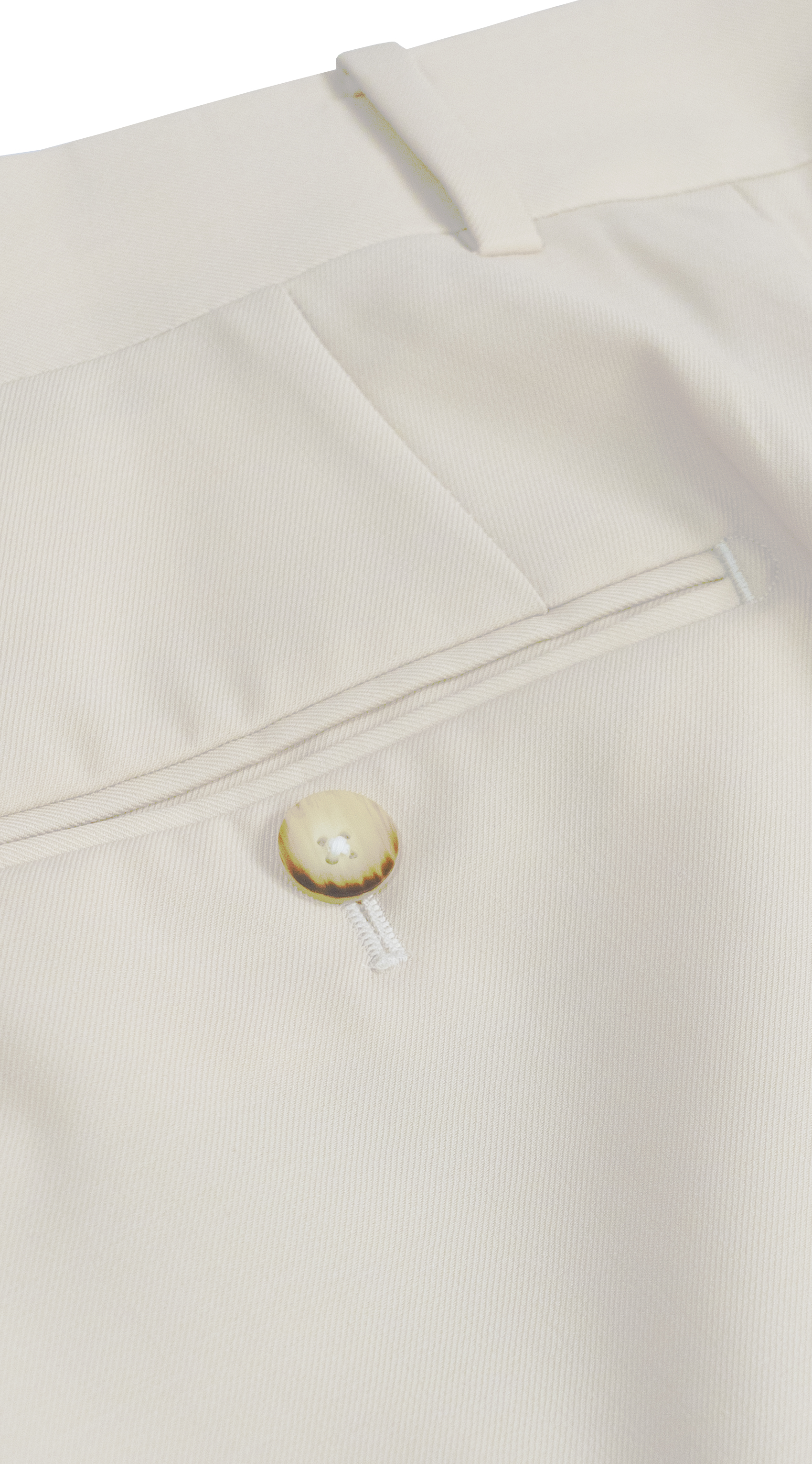 A slightly off-center top button on the trousers, known as Displaced Fastening, lends a touch of sophistication and elevates the suit's overall elegance.